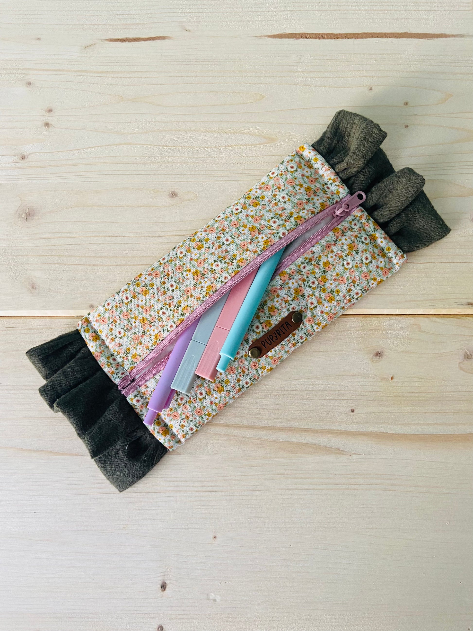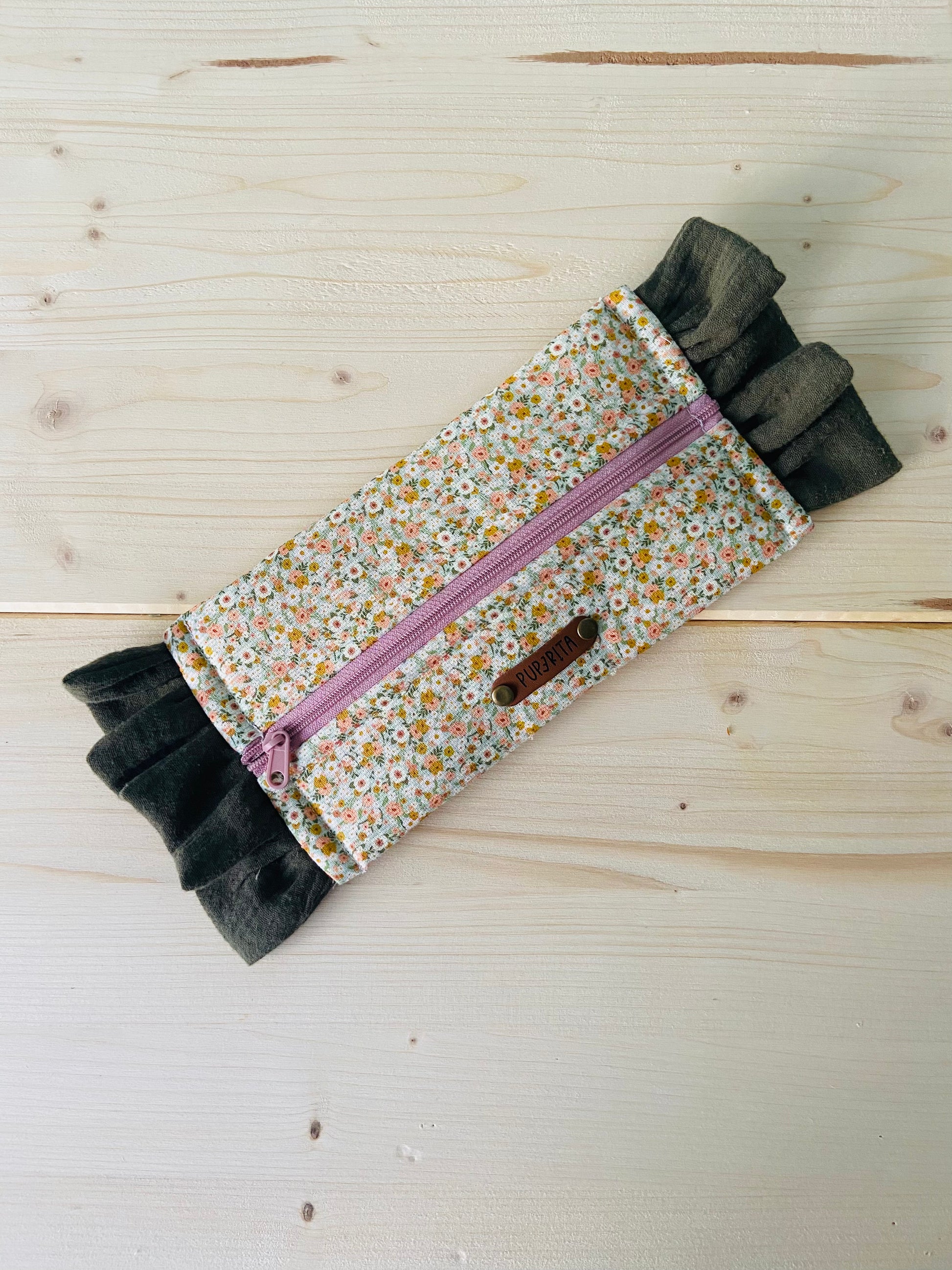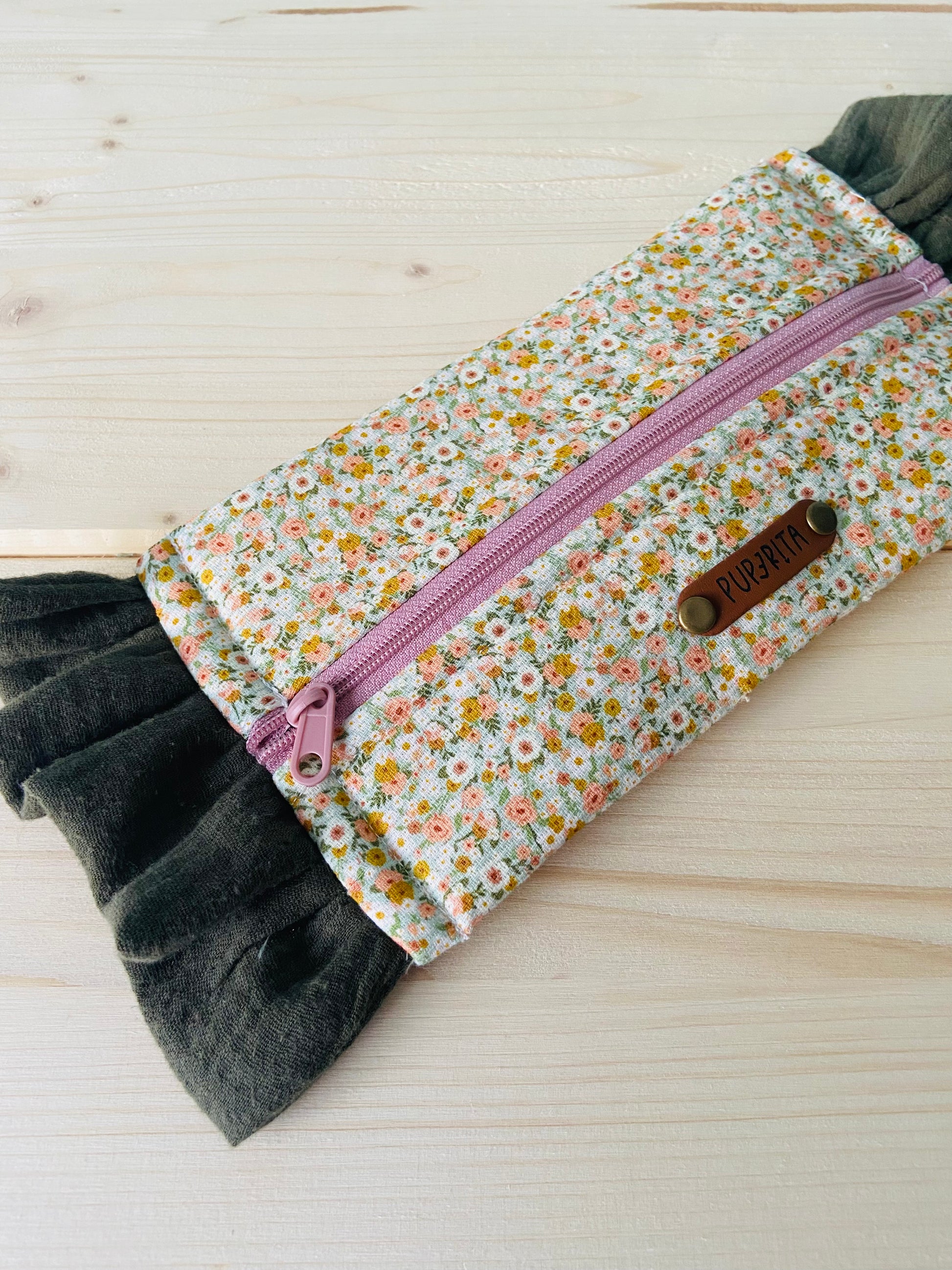 Estuche plano, para que ocupe lo menos posible y llevar lo imprescindible. Volante decorativo