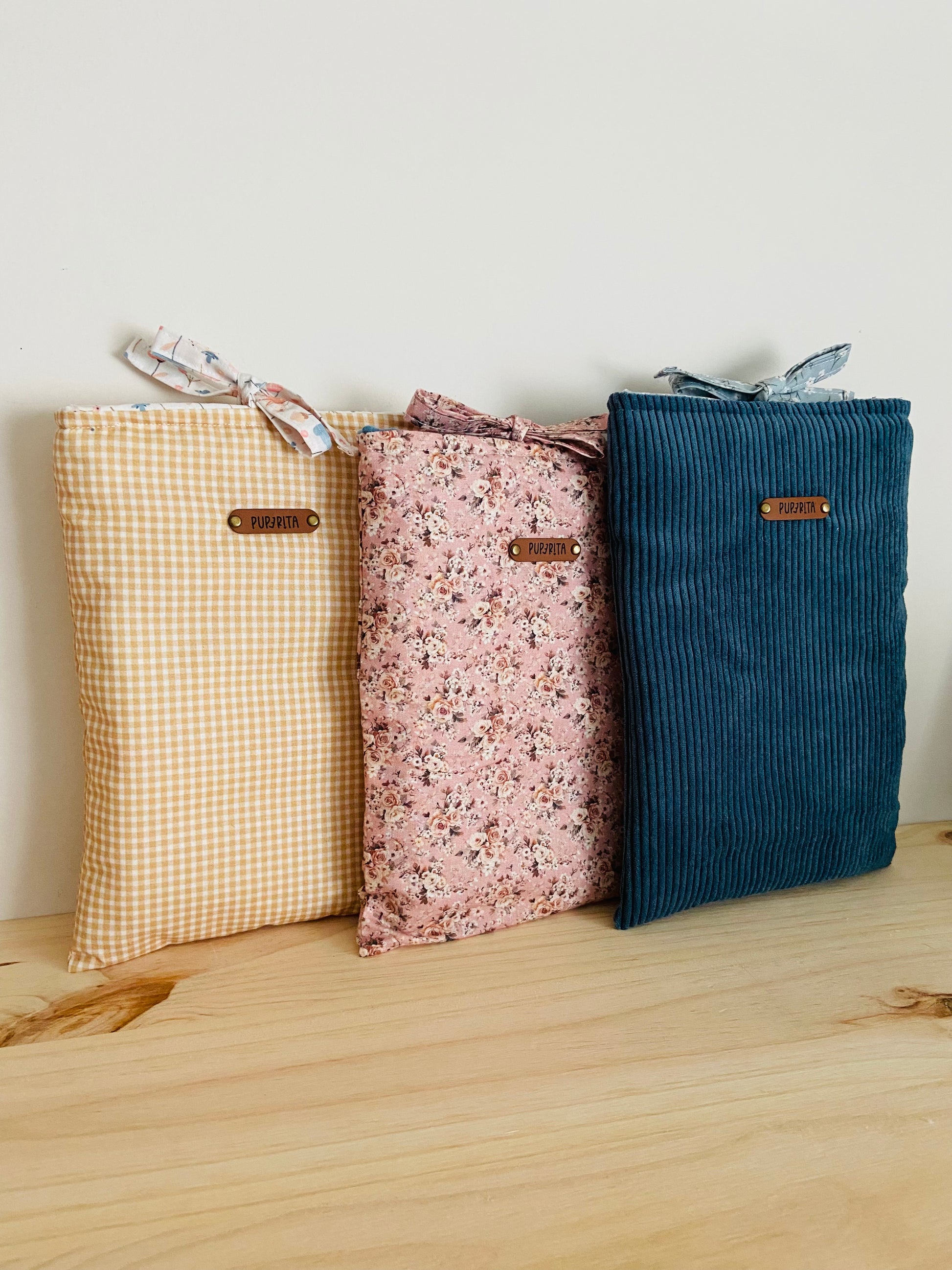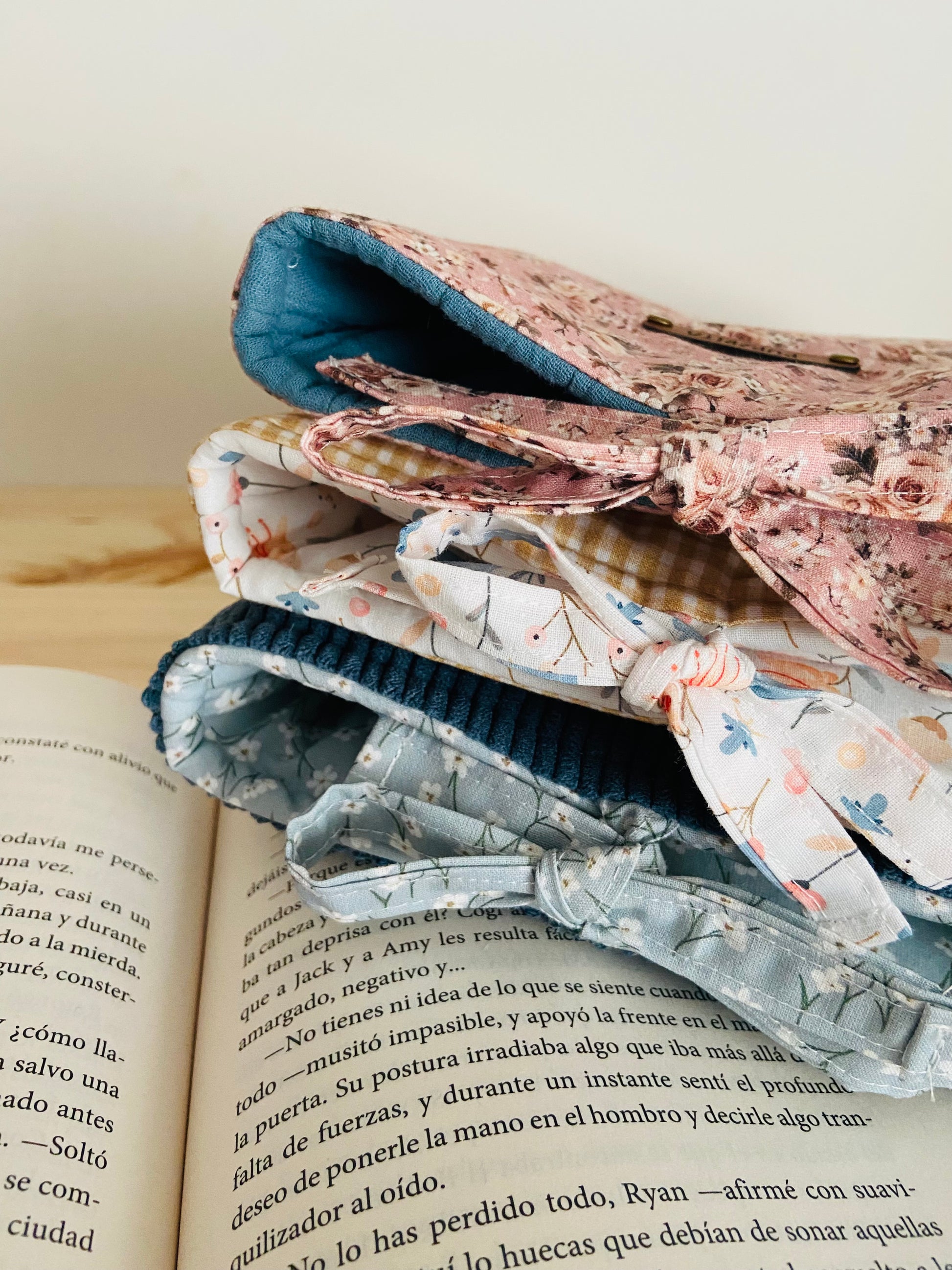 Funda de libro acolchada, cierre con lazo. Capacidad hasta libros con 385 páginas.