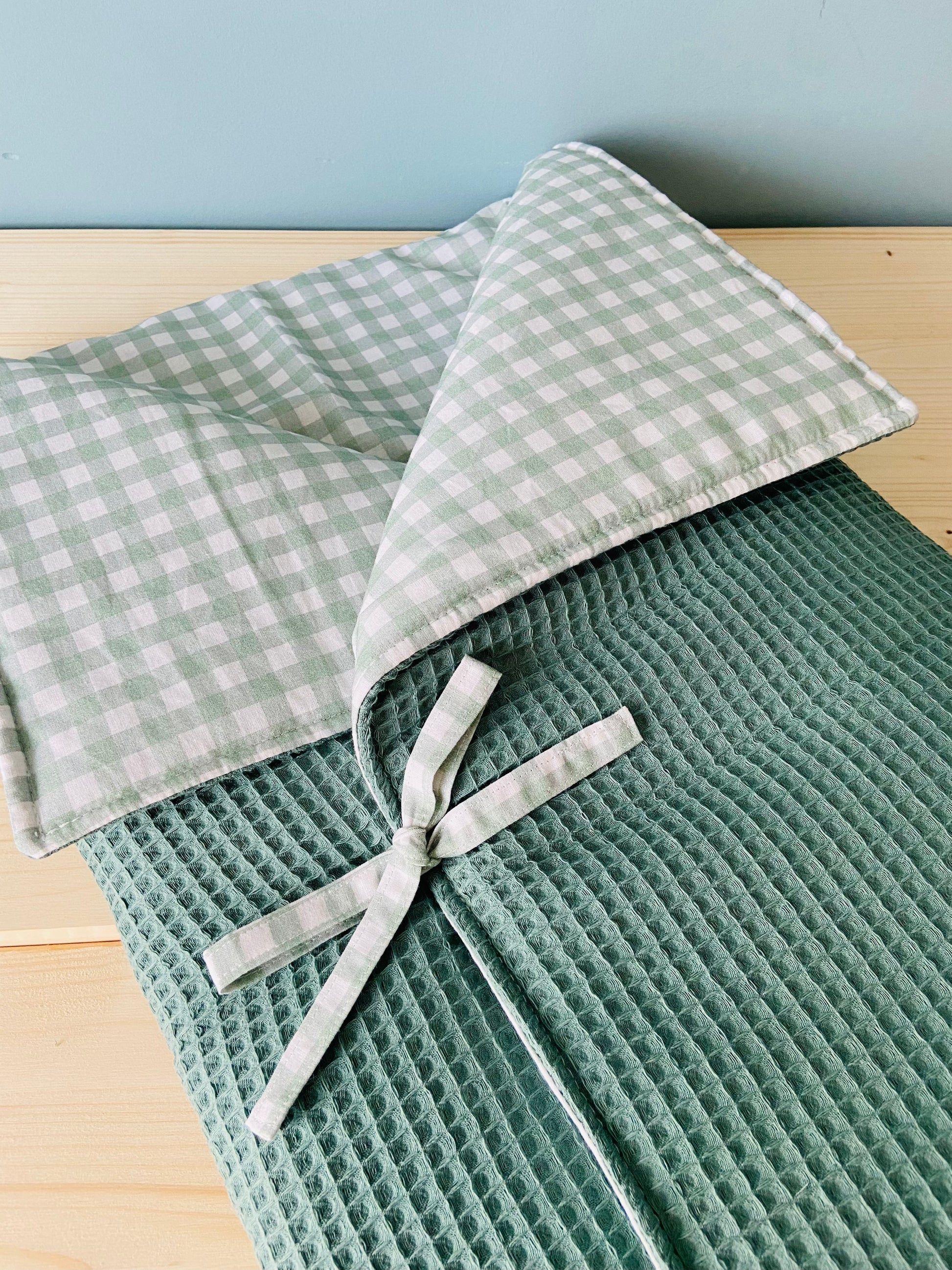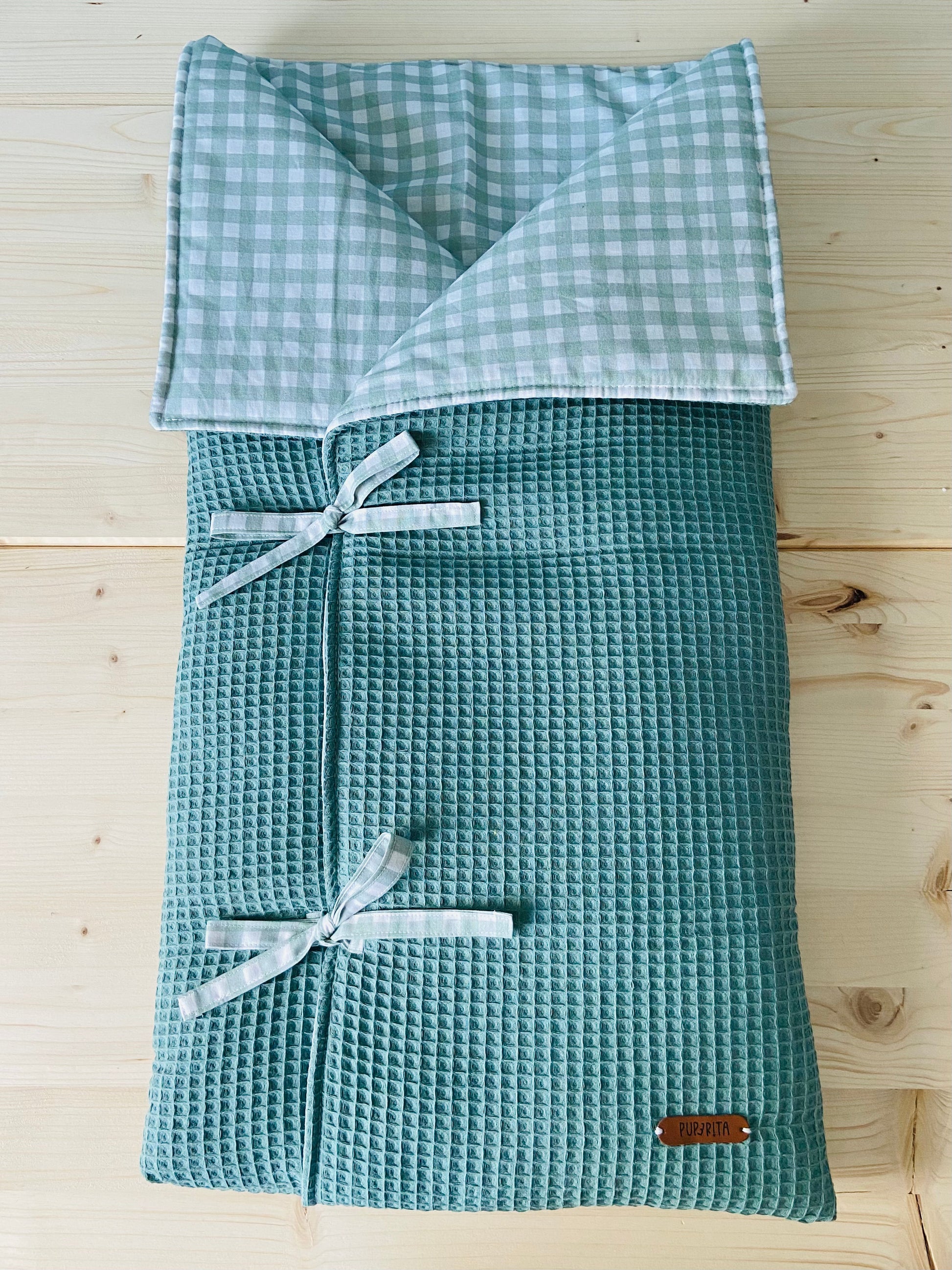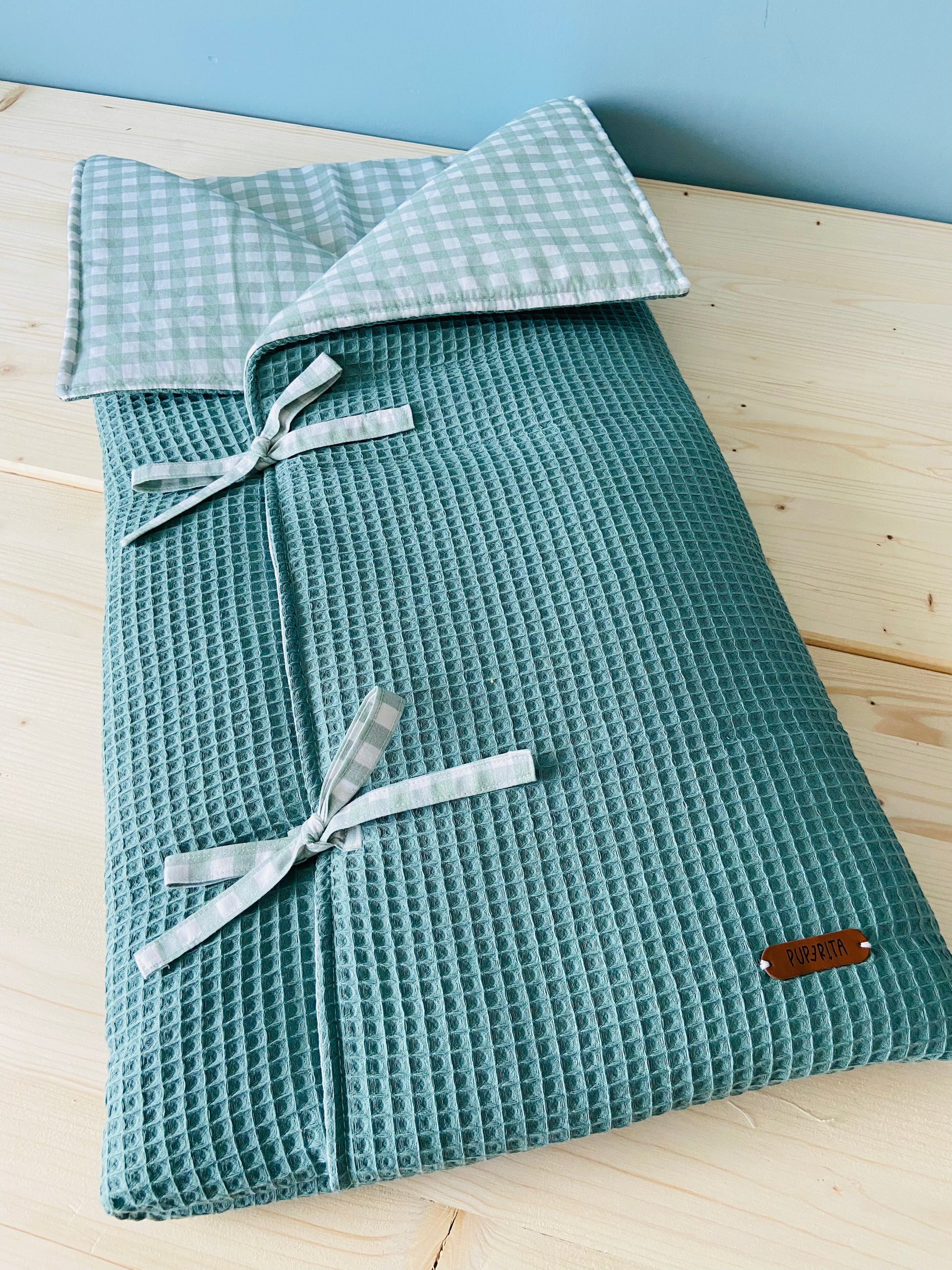 Saco para el capazo del carrito, con waffle y vichy combinados en la misma gama de color. Relleno de guata para que sea blandito y calentito.
